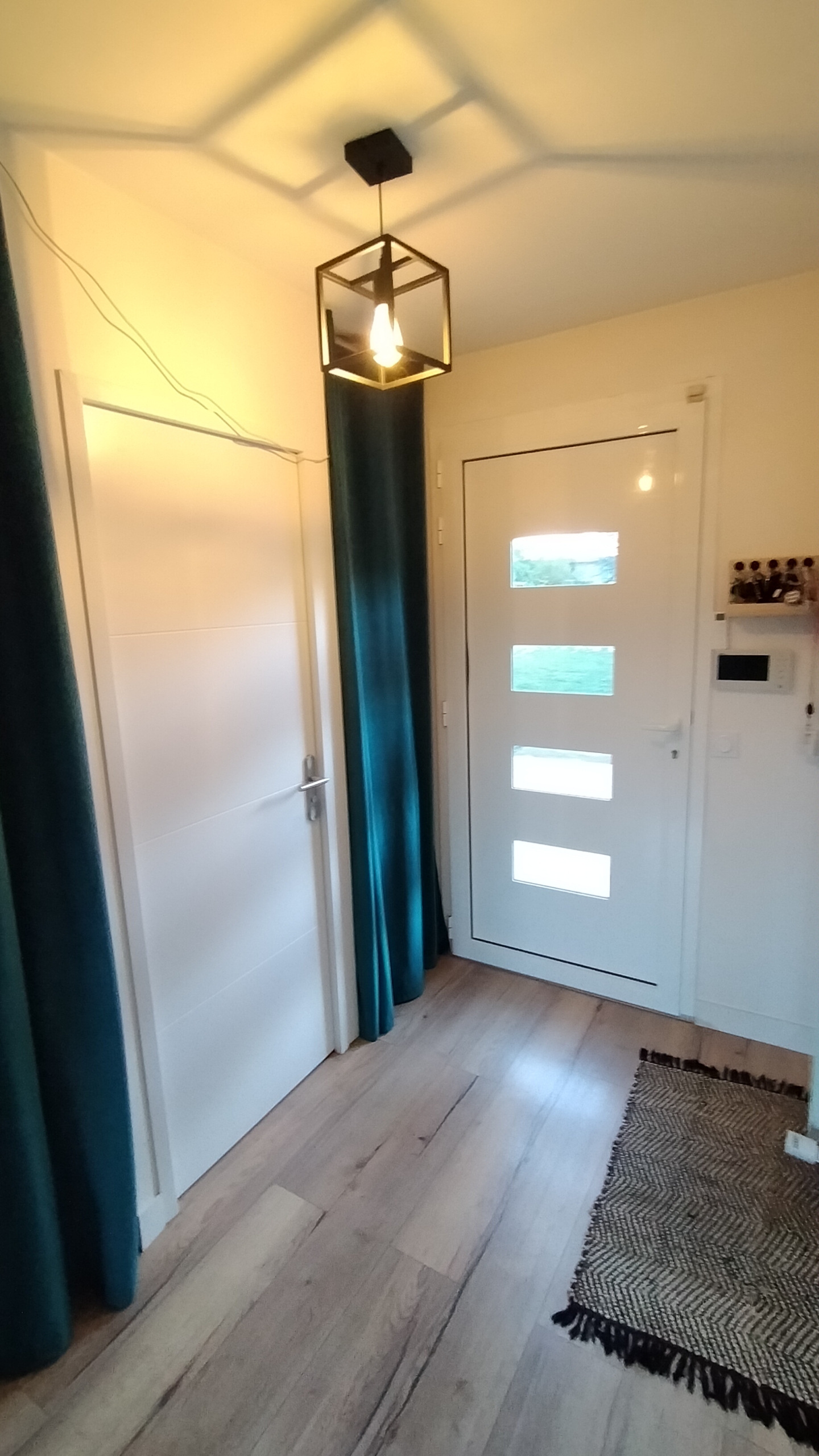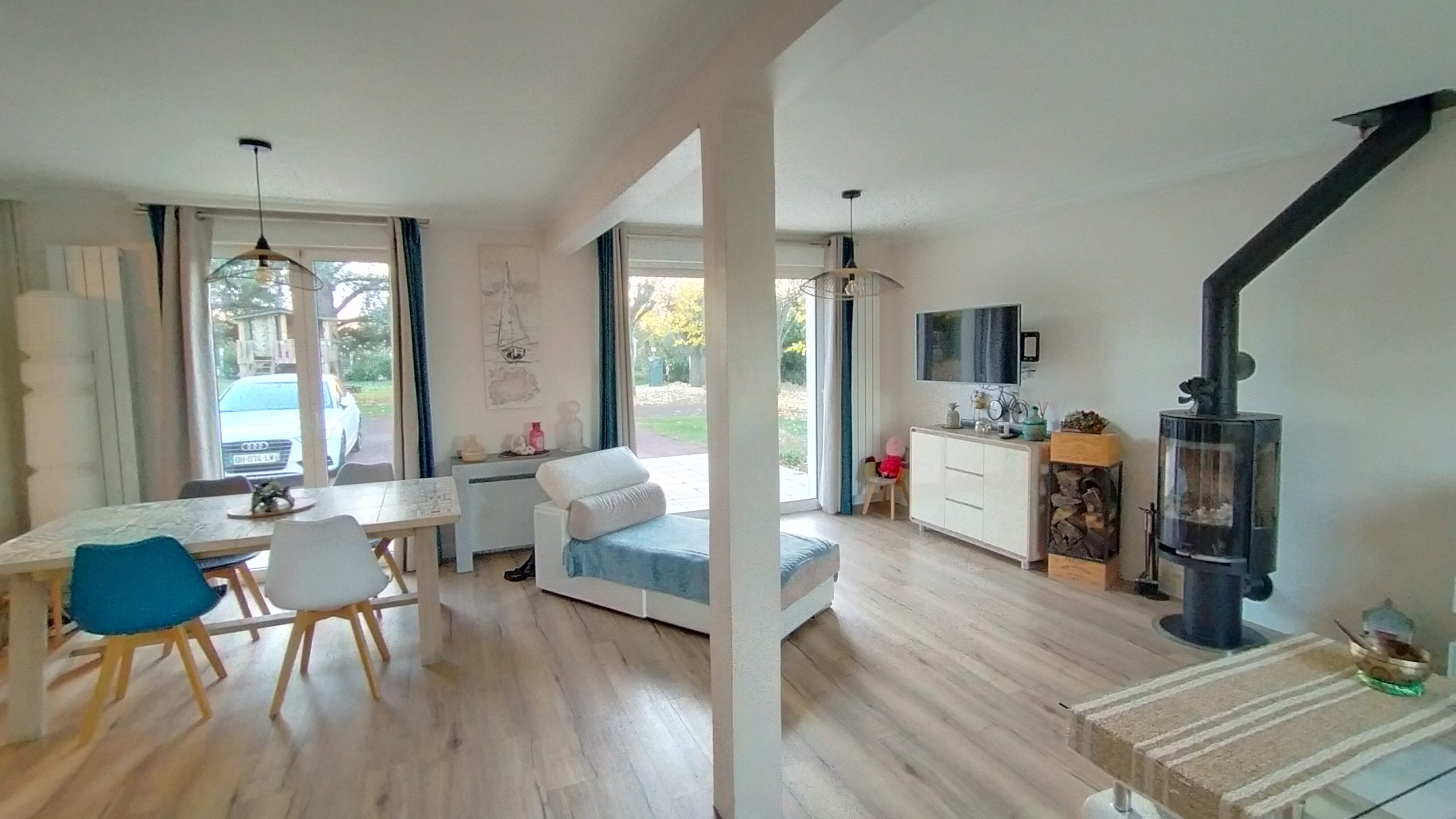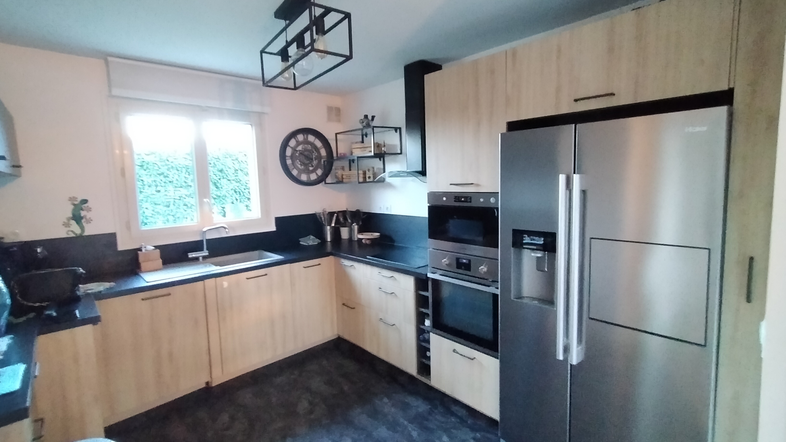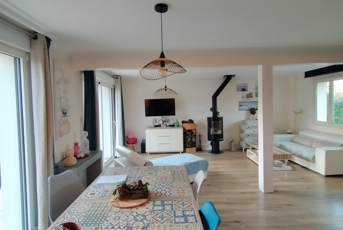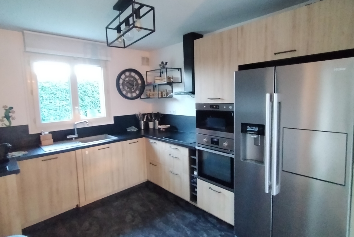 Dans village recherché du Vexin, au calme – Maison traditionnelle individuelle d’environ 90 m² (environ 100 m² surface utile), comprenant : entrée avec penderie, beau séjour double, lumineux, avec poêle à bois et accès terrasse, cuisine américaine aménagée équipée (four, plaques induction, hotte, MO), wc + lave-mains ; à l’étage (plancher béton) palier, 3 chambres dont 1 plus petite, salle de bains + douche 2ème wc. Sous-sol total avec garage, buanderie carrelée. Beau terrain plat d’environ 1.200 m² offrant la possibilité d’agrandir la maison (possibilité d’acquérir environ 800 m² supplémentaires). ENTIÈREMENT RÉNOVÉ. Belles prestations d’ensemble et environnement privilégié !