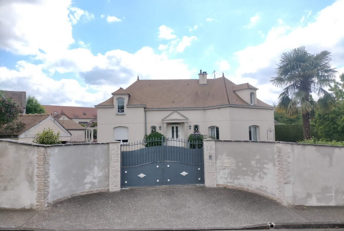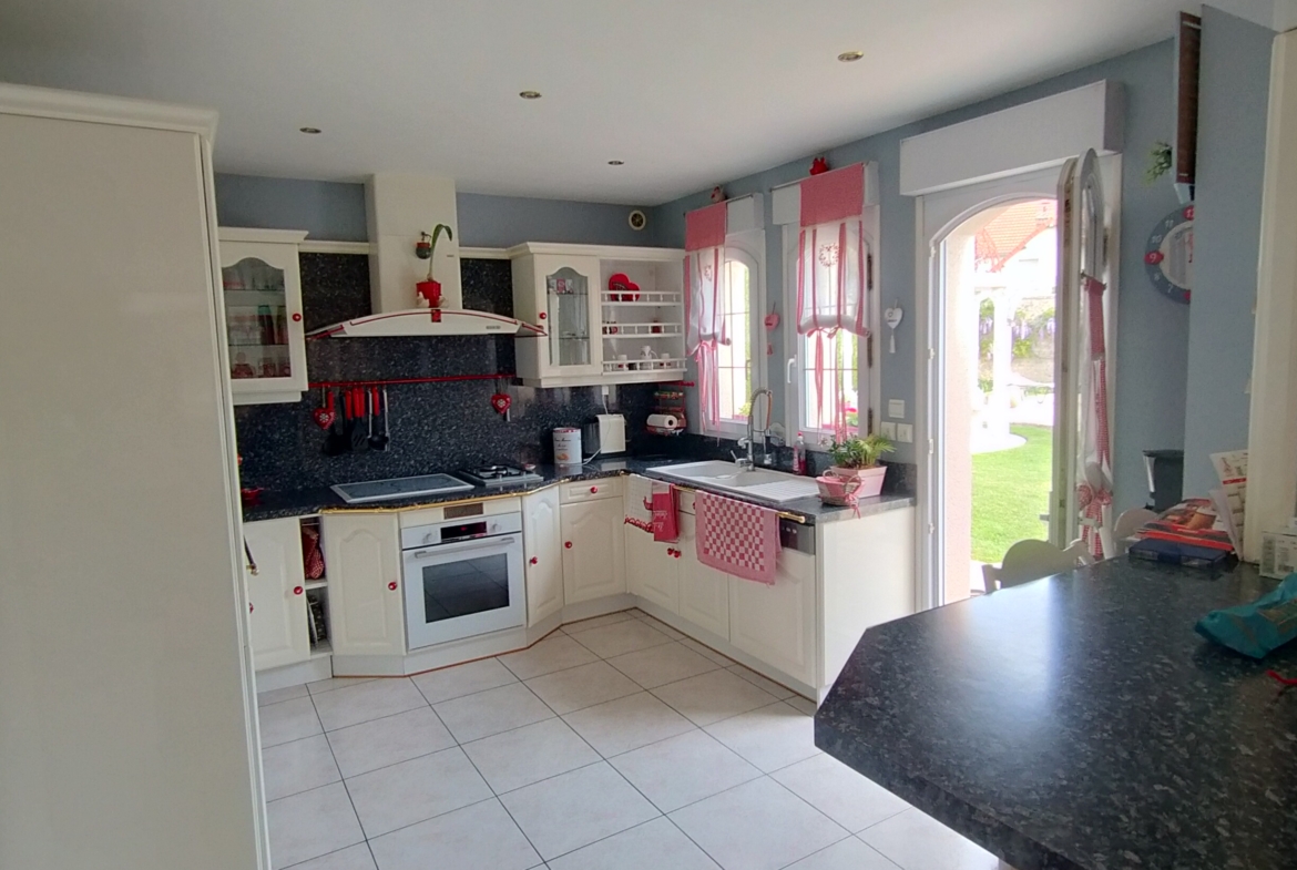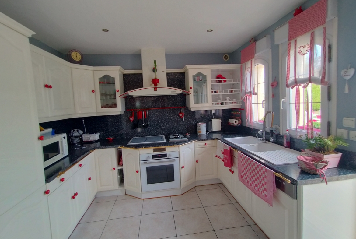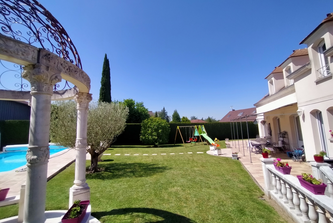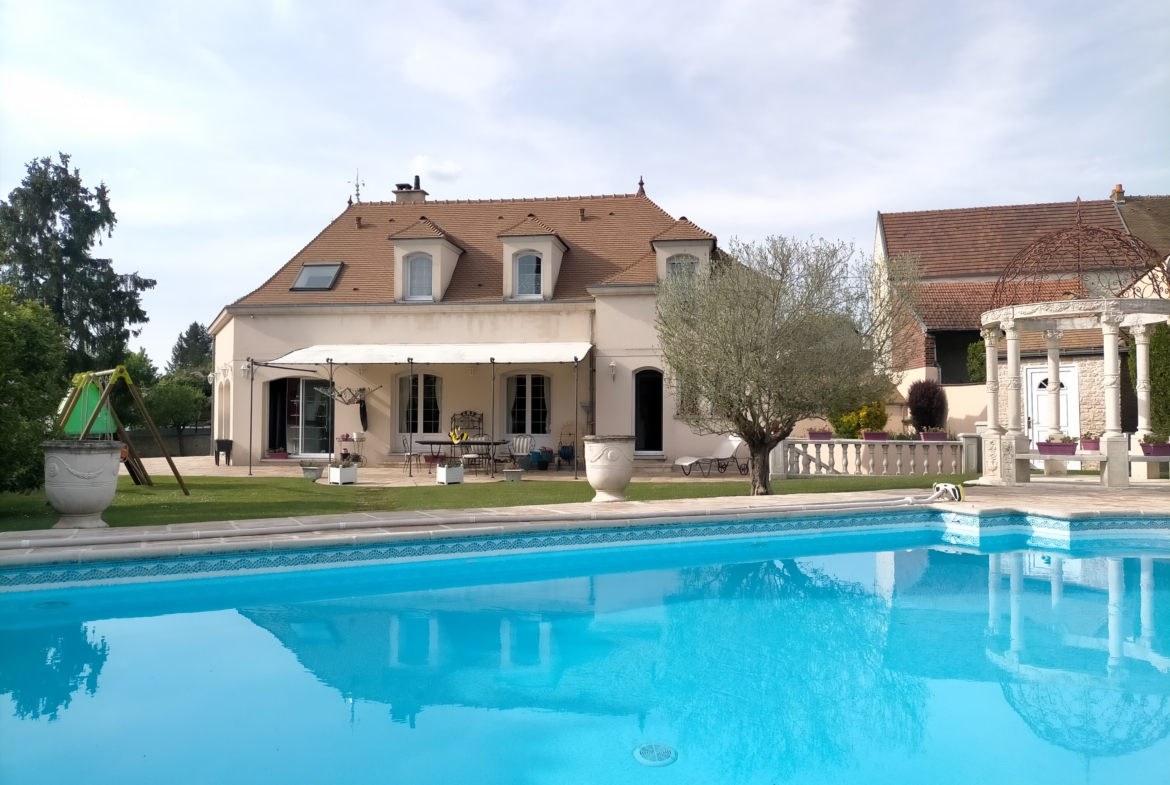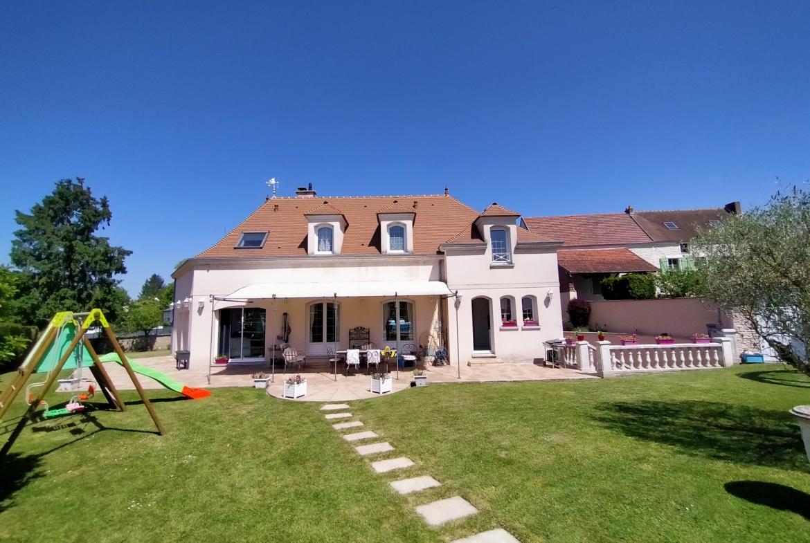 Dans village recherché du Vexin – Superbe villa de construction traditionnelle, élevée sur terrain d’environ 1.400 m², comprenant : hall avec placard, séjour triple + cheminée et accès terrasse, cuisine US aménagée équipée, 4 chambres dont 2 suites parentales (1 en rc), 2ème SDB, bureau, cagibi. Sous-sol total avec garage, buanderie / chaufferie et salle de jeux / salle de cinéma. Très beau jardin clos de murs, avec piscine chauffée PAC (env. 11.50 x 5.50 m) et local technique, abri voiture. BELLES PRESTATIONS D’ENSEMBLE !