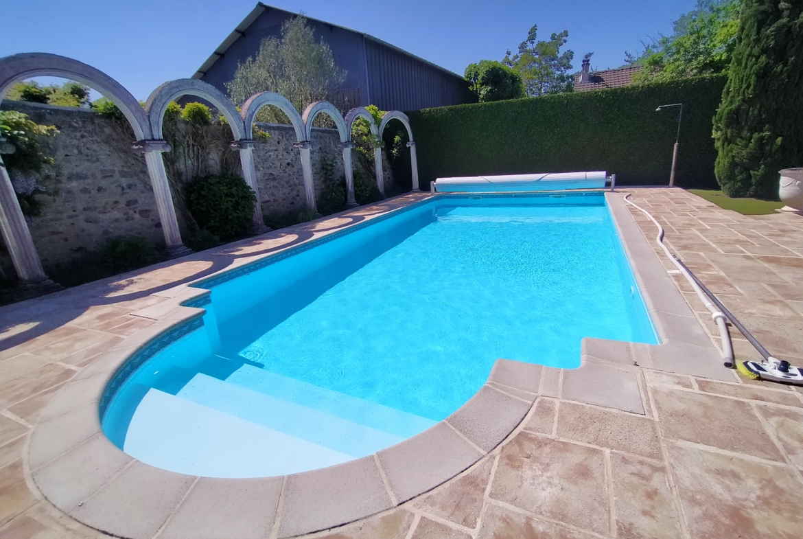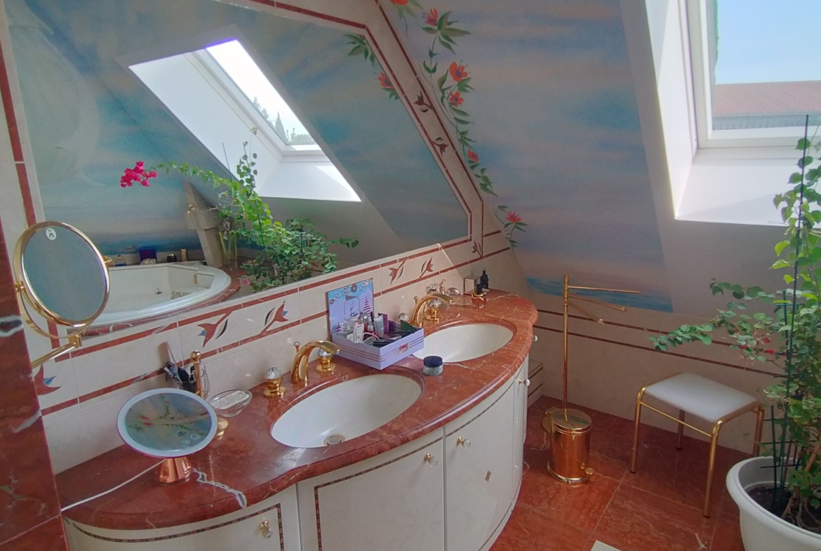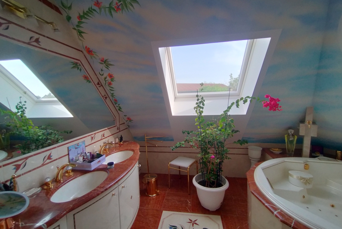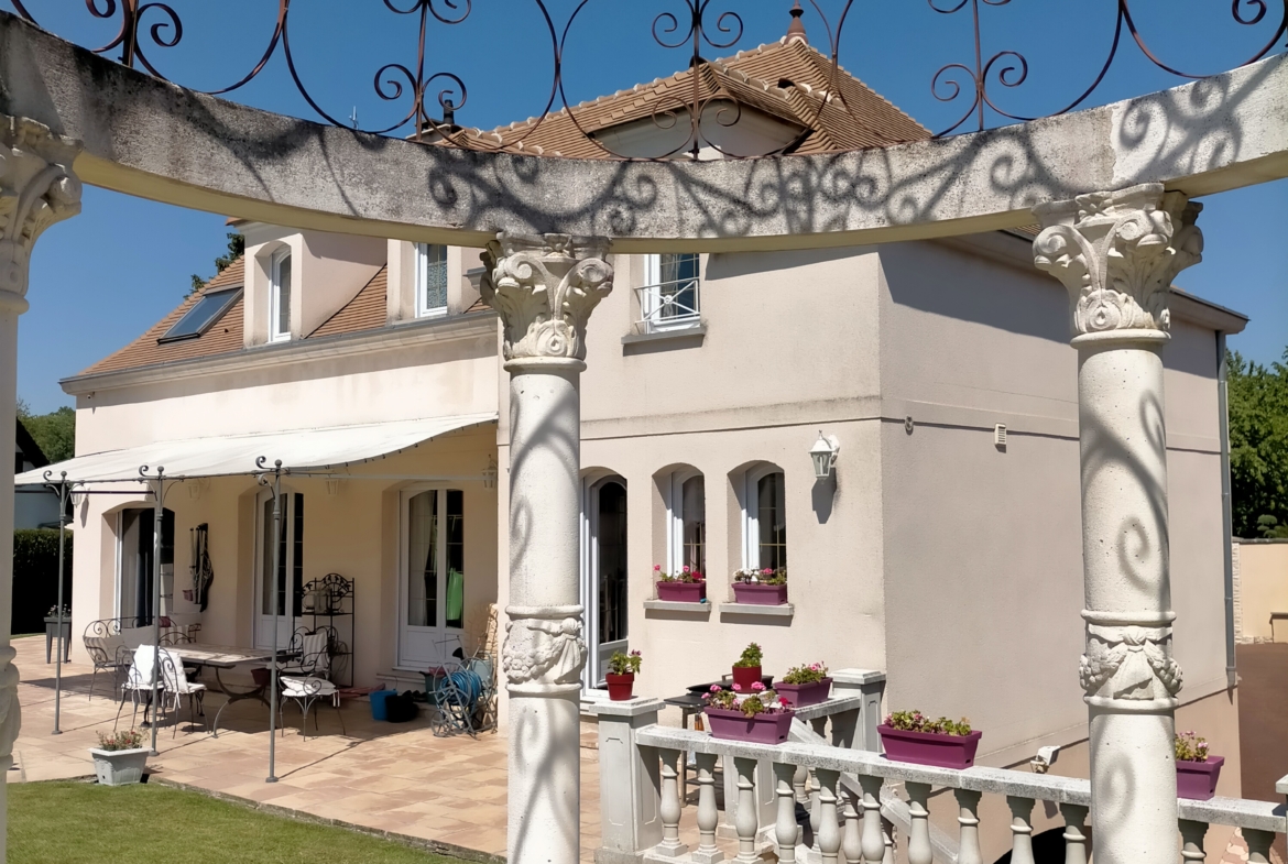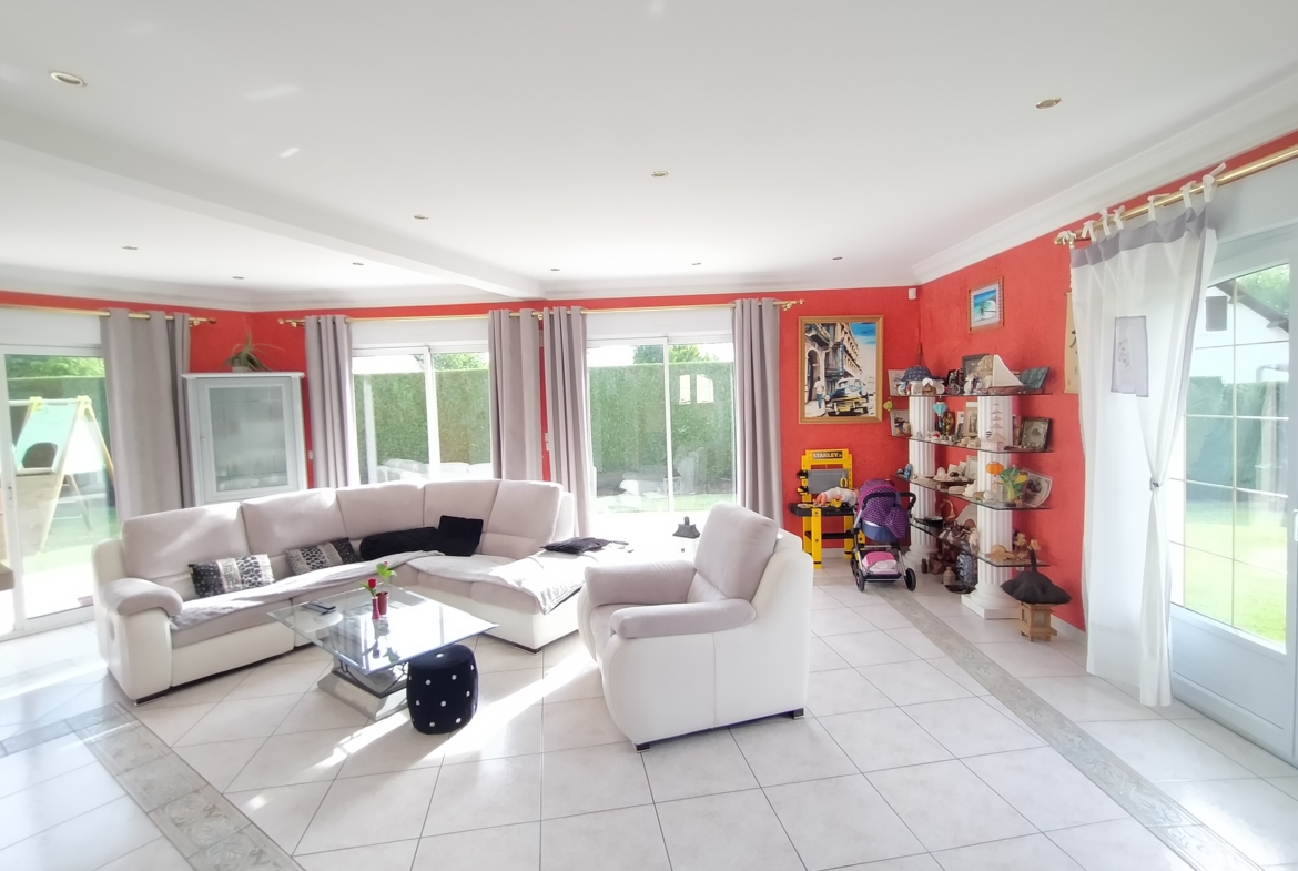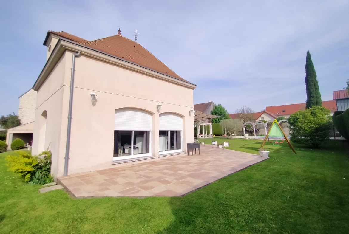 Dans village recherché du Vexin – Superbe villa de construction traditionnelle, élevée sur terrain d’environ 1.400 m², comprenant : hall avec placard, séjour triple + cheminée et accès terrasse, cuisine US aménagée équipée, 4 chambres dont 2 suites parentales (1 en rc), 2ème SDB, bureau, cagibi. Sous-sol total avec garage, buanderie / chaufferie et salle de jeux / salle de cinéma. Très beau jardin clos de murs, avec piscine chauffée PAC (env. 11.50 x 5.50 m) et local technique, abri voiture. BELLES PRESTATIONS D’ENSEMBLE !