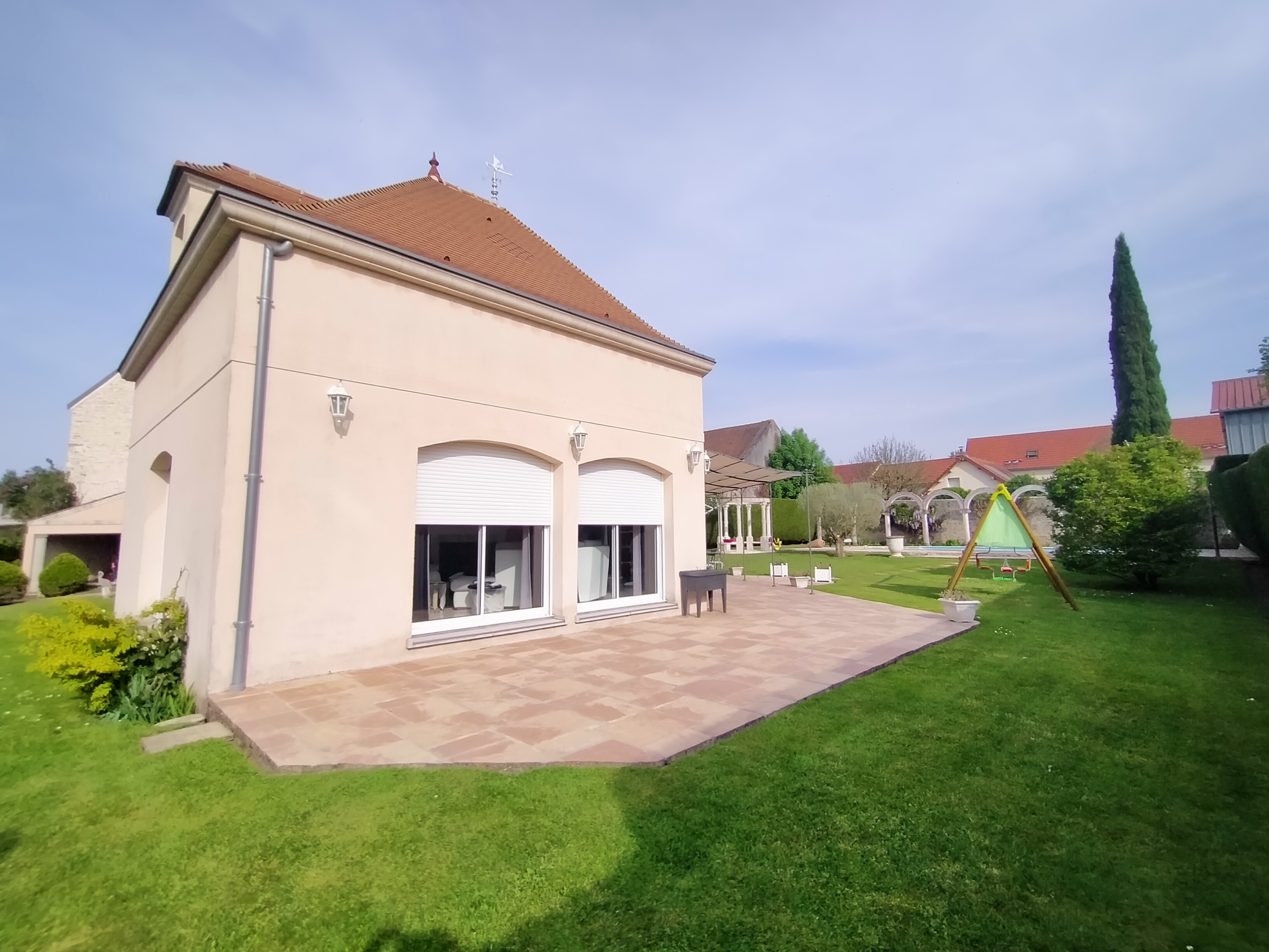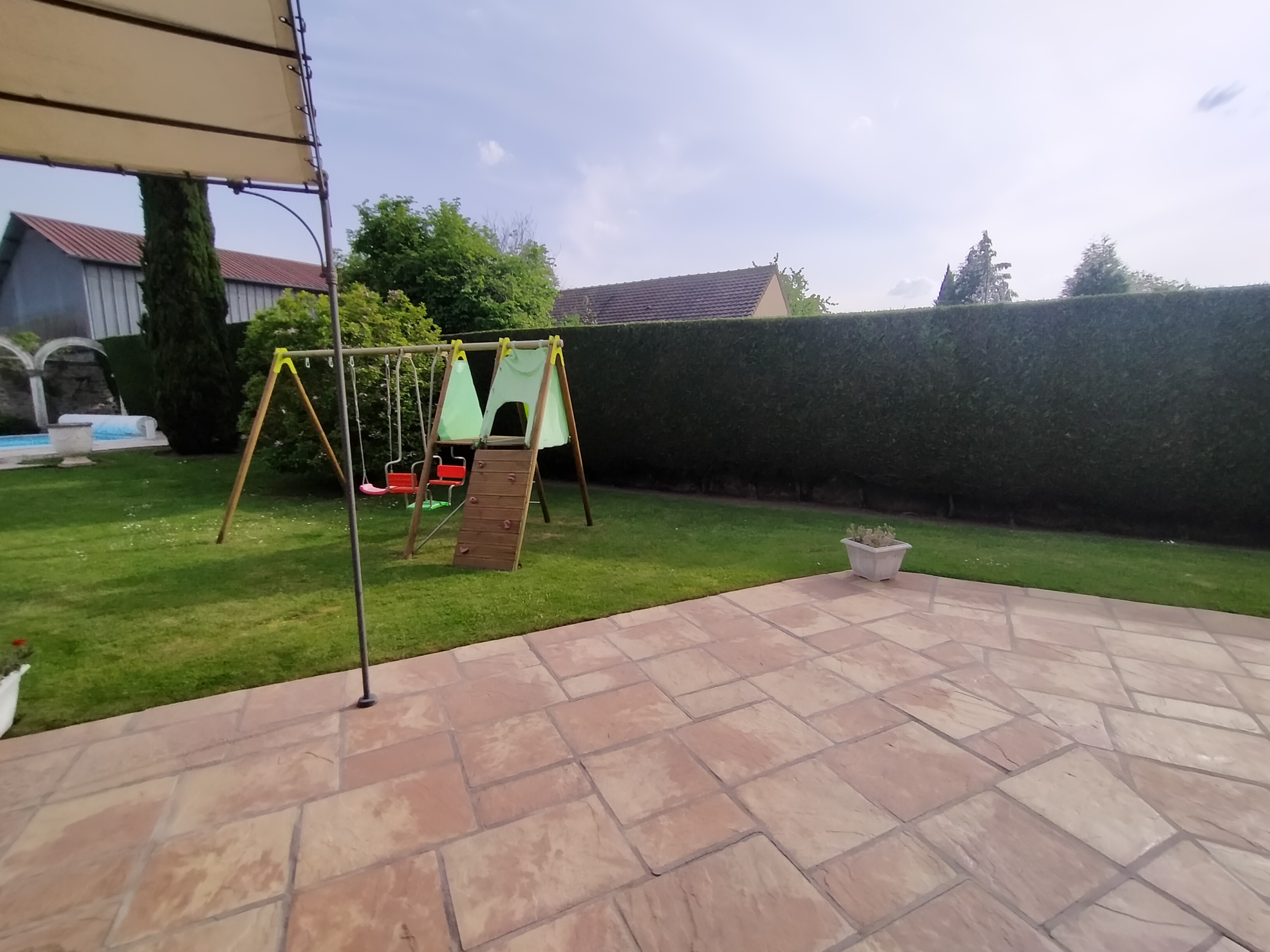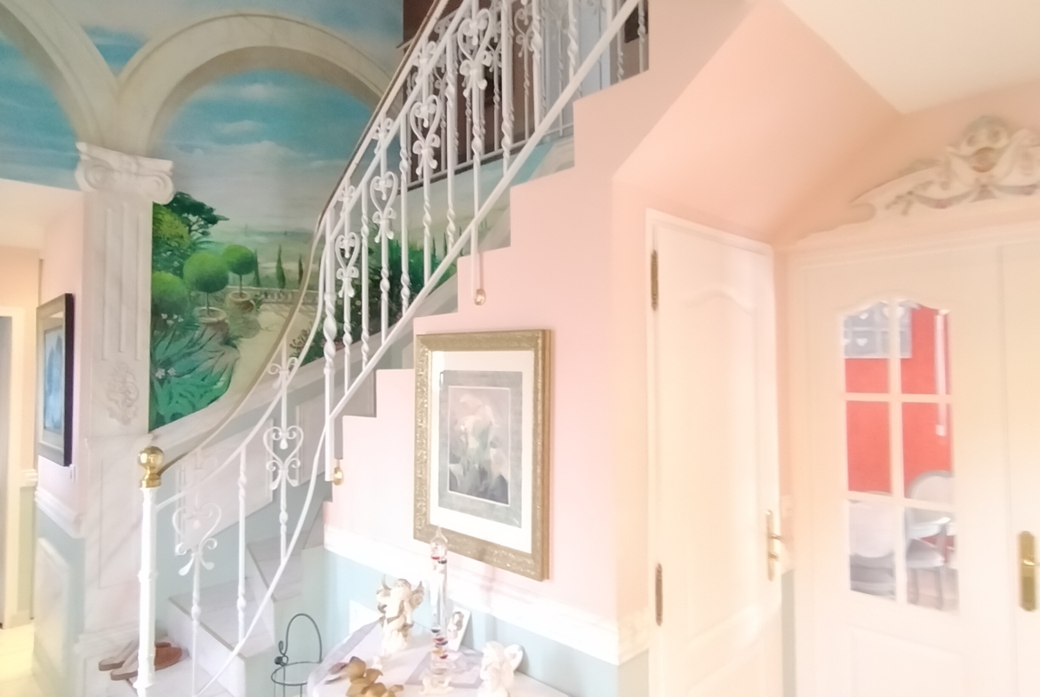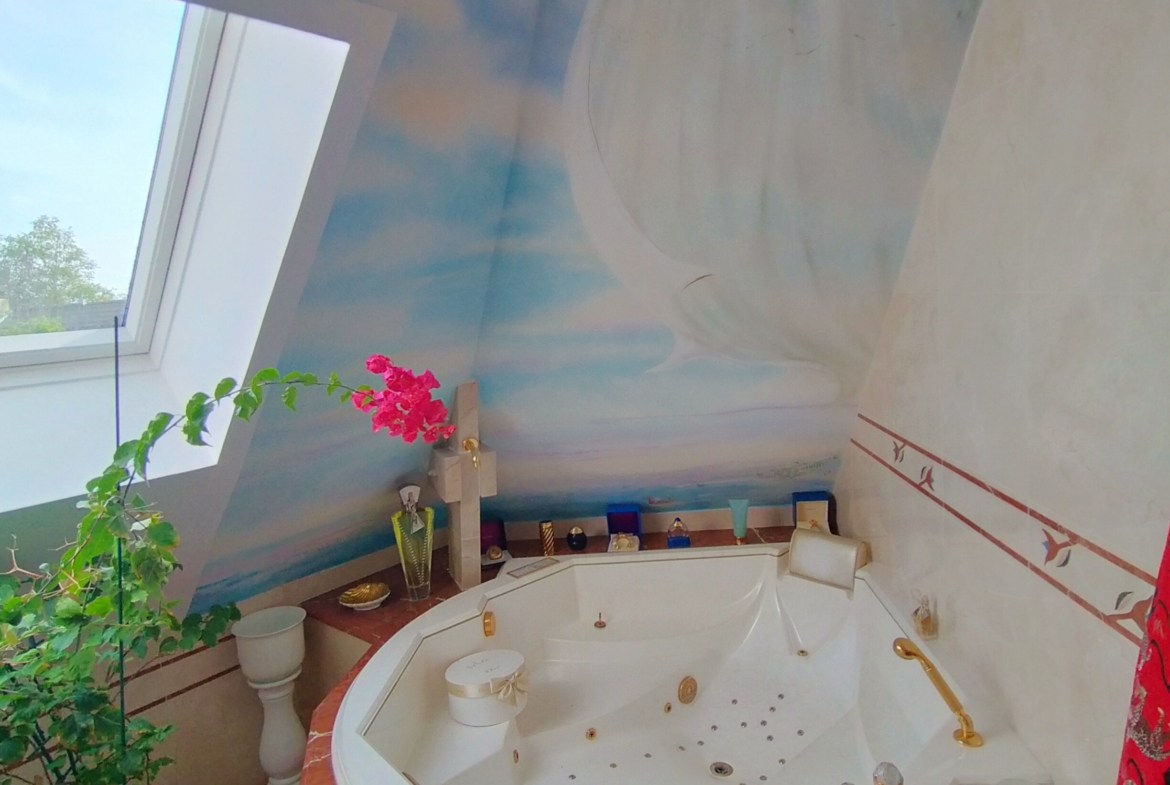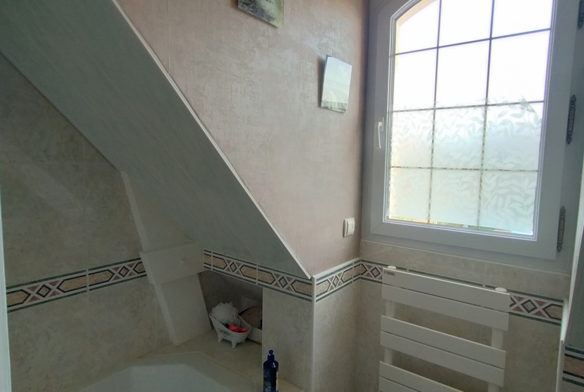 Dans village recherché du Vexin – Superbe villa de construction traditionnelle, élevée sur terrain d’environ 1.400 m², comprenant : hall avec placard, séjour triple + cheminée et accès terrasse, cuisine US aménagée équipée, 4 chambres dont 2 suites parentales (1 en rc), 2ème SDB, bureau, cagibi. Sous-sol total avec garage, buanderie / chaufferie et salle de jeux / salle de cinéma. Très beau jardin clos de murs, avec piscine chauffée PAC (env. 11.50 x 5.50 m) et local technique, abri voiture. BELLES PRESTATIONS D’ENSEMBLE !