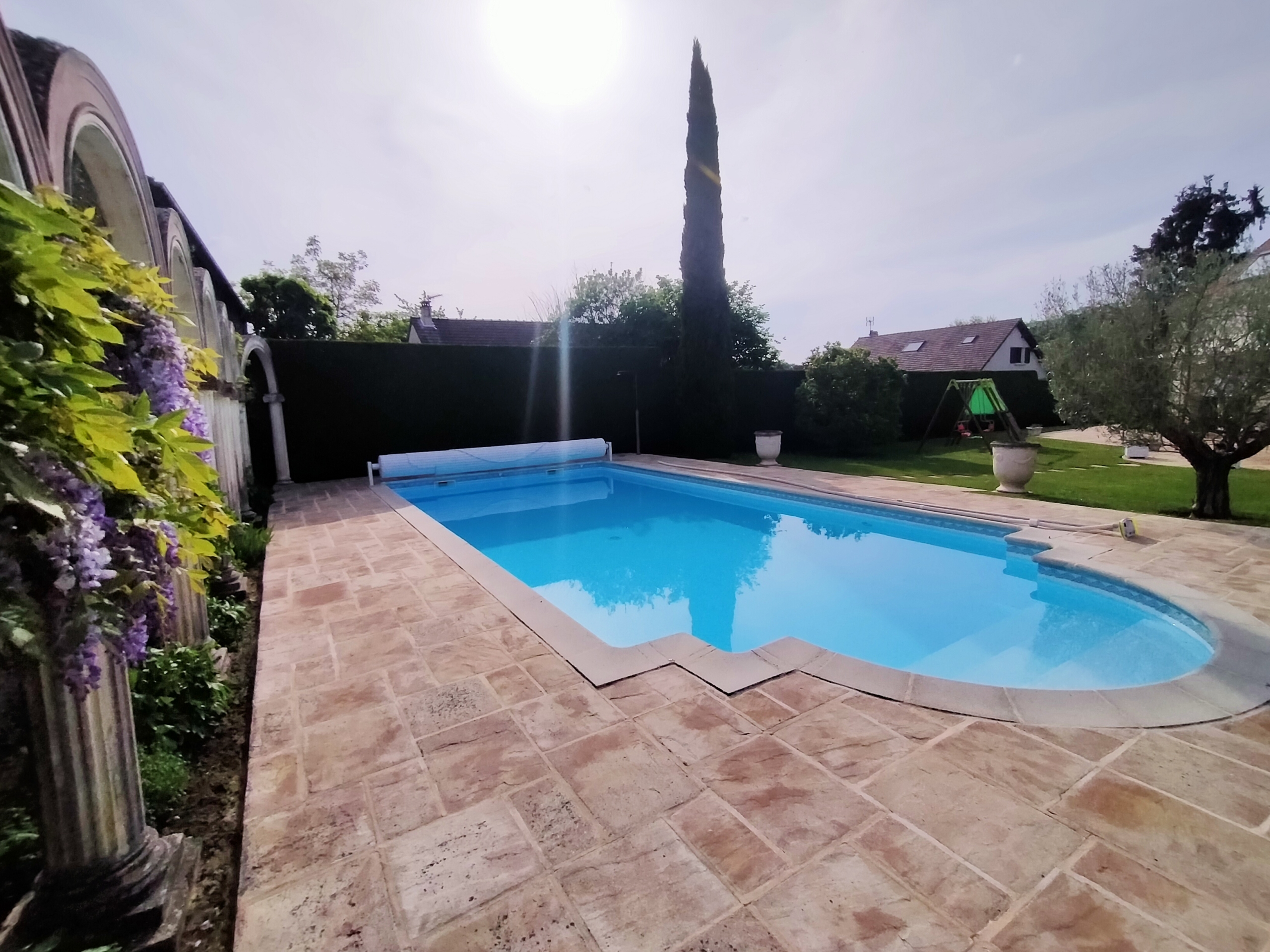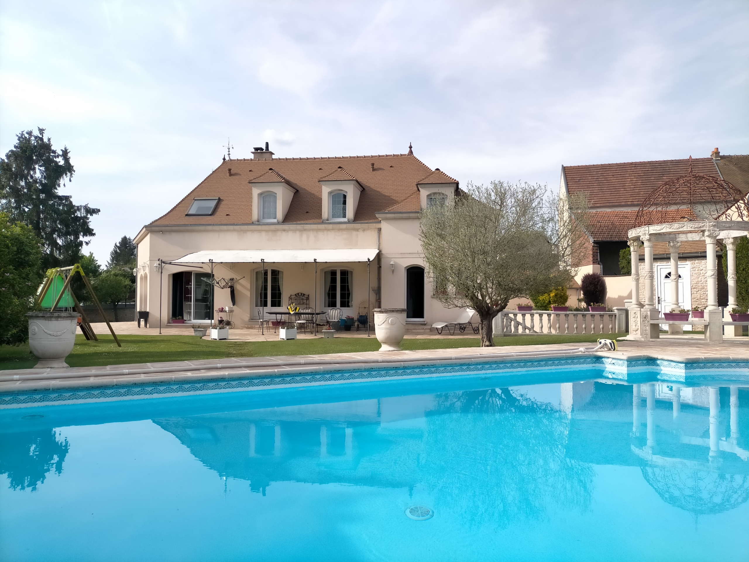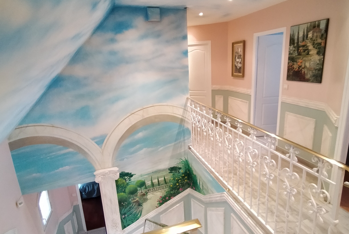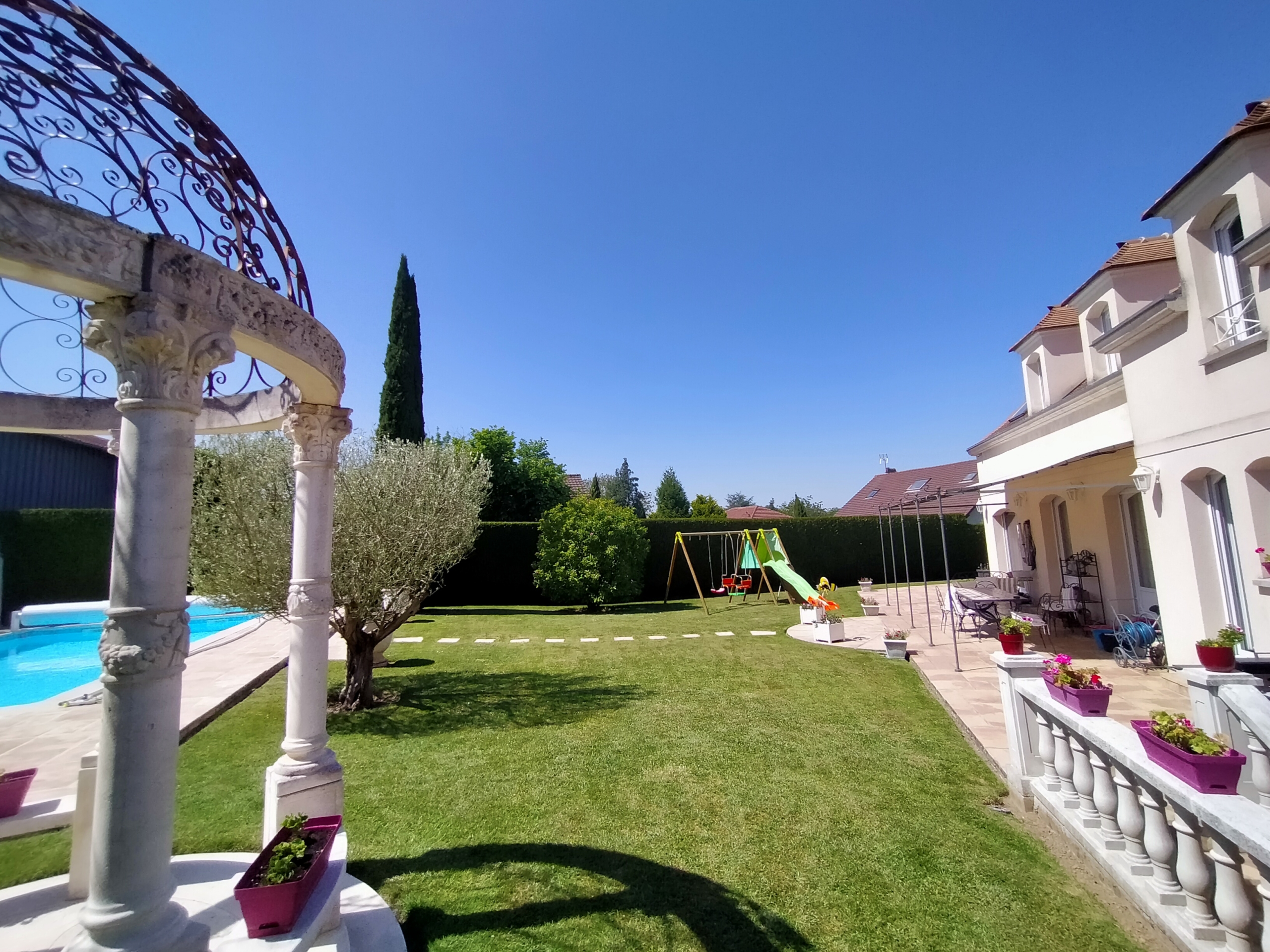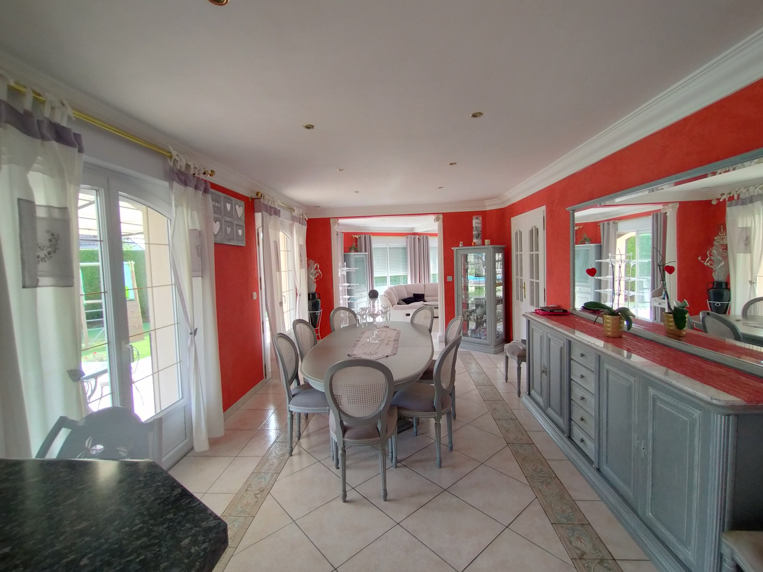 Dans village recherché du Vexin – Superbe villa de construction traditionnelle, élevée sur terrain d’environ 1.400 m², comprenant : hall avec placard, séjour triple + cheminée et accès terrasse, cuisine US aménagée équipée, 4 chambres dont 2 suites parentales (1 en rc), 2ème SDB, bureau, cagibi. Sous-sol total avec garage, buanderie / chaufferie et salle de jeux / salle de cinéma. Très beau jardin clos de murs, avec piscine chauffée PAC (env. 11.50 x 5.50 m) et local technique, abri voiture. BELLES PRESTATIONS D’ENSEMBLE !
